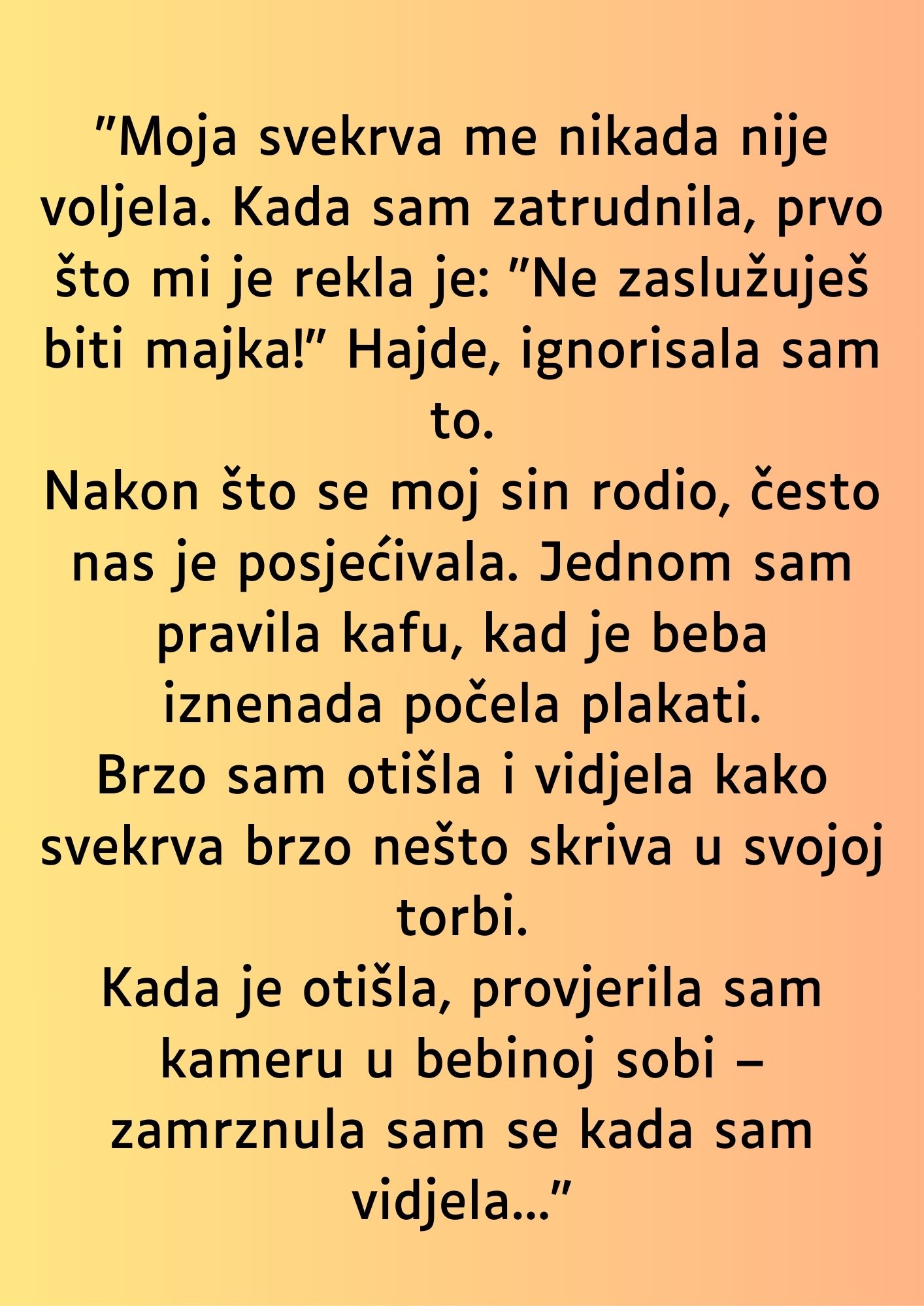 Nakon rođenja njihova sina, svekrva je počela češće dolaziti u posjete. U početku su njeni dolasci izgledali kao pokušaj zbližavanja s unukom, ali ubrzo se otkrilo da se iza tih namjera kriju sumnje i manipulacija. Mlada majka je s vremenom postajala sve više svjesna toksične dinamike, ali je osjećala obavezu da pruži priliku za izgradnju odnosa. Jedan od najtragičnijih trenutaka desio se kada je mlada majka čula plač iz dječije sobe. U trenutku kada je potrčala da vidi šta se dešava, zatekla je svekrvu koja je sumnjivo sklanjala nešto u svoju torbu. Ta slika je ostavila snažan utisak na nju, prouzrokujući osjećaj nelagode i straha. Takvi trenuci su samo pojačavali njen osjećaj izolacije i nesigurnosti u vlastitim odlukama kao majke.