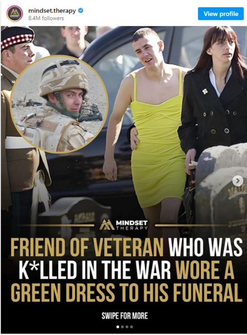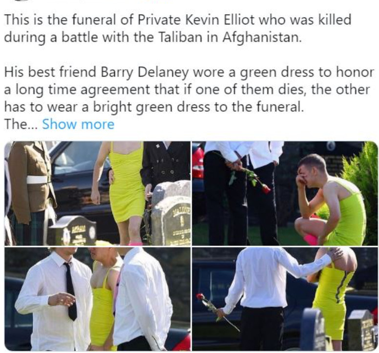 U svjetlu recentnih sukoba i borbi koje su obeležile Afganistan, priča o britanskom vojniku Kevinu Elliottu i njegovom prijatelju Barryju DeIaneyju ističe se kao emotivna i snažna. Njihovo prijateljstvo nije bilo samo obična veza između dvojice muškaraca, već duboko emocionalno iskustvo koje je izgradilo posebne veze između njih. Naime, nakon što je Elliott bio upućen u Afganistan, DeIaney je sklopio poseban dogovor sa svojim prijateljem. Ovaj pakt je sadržavao obećanje da će DeIaney, u slučaju Elliottove smrti, nositi žensku haljinu na njegovom sprovodu. Takva odluka, iako naizgled neobična, proizašla je iz dubokog prijateljstva i razumijevanja između njih dvojice, koji su zajedno prolazili kroz izazove vojne službe. Kada je vijest o smrti vojnika Elliotta stigla do DeIaneya, on je bio suočen s ispunjavanjem svog obećanja. Elliott je, nažalost, poginuo u zasjedi talibana u Afganistanu, a DeIaney je, u skladu s dogovorom, obuče žensku haljinu na sprovodu. Ovaj čin izazvao je različite reakcije među prisutnima, ali je istovremeno simbolizovao duboku povezanost i ljubav prema prijatelju. U crkvi Svete Marije, gdje je sprovod održan, okupilo se oko 1000 ljudi, a DeIaney je bio svjestan težine svojeg čina, ali i obećanja koje je dao. Haljina koju je nosio nije predstavljala samo stil, već je bila simbol njihovog prijateljstva i hrabrosti da budu svoji čak i u najtežim trenucima.