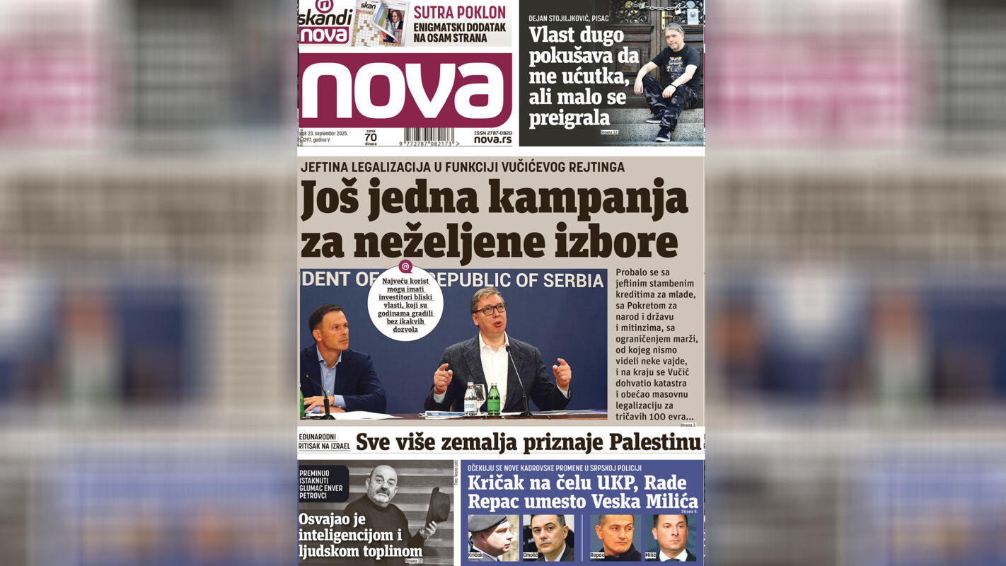 U novinama “Nova”, u utorak, pročitajte: Da li je Vučićeva najava legalizacije bespravnih objekata još jedan od propalih projekata za dizanje rejtinga; Očekuju se nove kadrovske promene u srpskoj policiji: Kričak na čelu UKP, Repac umesto Milića; Sekretarki Medicinskog fakulteta koja je prijavilča nezakonitu smenu dekanke,preti otkaz.