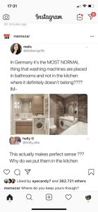 - Tema je svojevremeno izazvala raspravu i na društvenim mrežama, kada je jedna korisnica podelila svoje iznenađenje činjenicom da je u Nemačkoj sasvim normalno da se veš pere u kupatilu. Ona je dolazila iz Velike Britanije, gde je, kao i u nekim drugim zapadnoevropskim zemljama, uobičajeno da se mašina za pranje veša nalazi u kuhinji. Ova informacija bila je dovoljna da se povede živahna diskusija o tome šta je „ispravno“, a šta samo stvar navike.