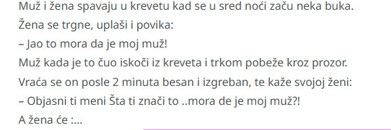 U današnje vrijeme, često se susrećemo s situacijama koje nas mogu iznenaditi i nasmijati, bez obzira na to koliko su svakodnevne. Ova priča o mužu i ženi, koja se odvija u intimi bračnog kreveta, počinje mirno, ali se brzo pretvara u komični spektakl. Noćna tišina iznenada se prekida misterioznom bukom koja ih oboje izbacuje iz stanja mira. U trenutku panike, žena izgovara rečenicu koja će pokrenuti lavinu: „To mora da je moj muž!” Ova izjava, iako zbunjujuća, postaje ključna za daljnji razvoj događaja i otvara vrata za razna tumačenja i reakcije.