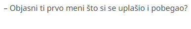 Žena, umjesto da se izvini ili objasni, odlučuje uzvratiti pitanjem: „Zašto si se uplašio i pobegao?” Ova interakcija ne samo da razotkriva temeljne karakteristike njihovih ličnosti, nego i pokazuje kako humor može proizaći iz nepredvidivih trenutaka. U realnosti, reakcije ljudi na stresne situacije često su puno duhovitije nego što bismo očekivali. Ova situacija postaje komedija nesporazuma, a ne sukoba. Ovdje možemo vidjeti kako je ponekad najbolje zadržati smirenost i pristupiti problemima s dozom humora, jer upravo humor može pomoći u smanjenju tenzija i olakšavanju komunikacije između partnera.